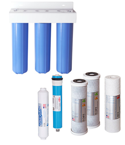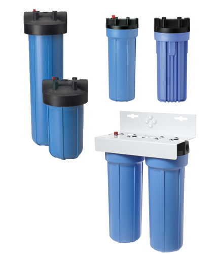 The Triple Iron Reduction system is a high capacity whole house iron reduction system. This system starts with one of our 1000 series 100% pure polypropylene 5 micron sediment filters. The second filter is a specialty iron reduction cartridge. The final filter is a high flow carbon polishing filter. This system is rated at 80,000 gal. with 1 ppm iron, and 40,000 gal. with 2 ppm of iron present. Pictured with optional stainless steel Flex Lines for added ease of installation.